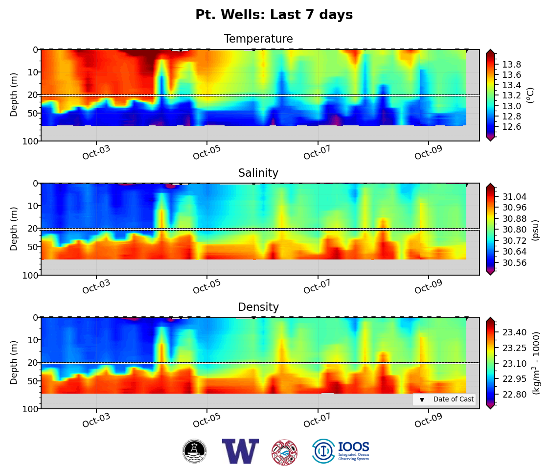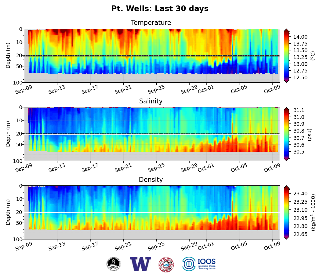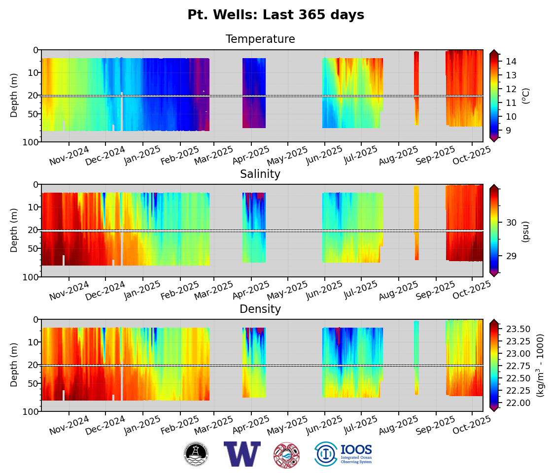 Mooring is at 47° 45.67' N, 122° 23.83' W, and 100 meters depth
